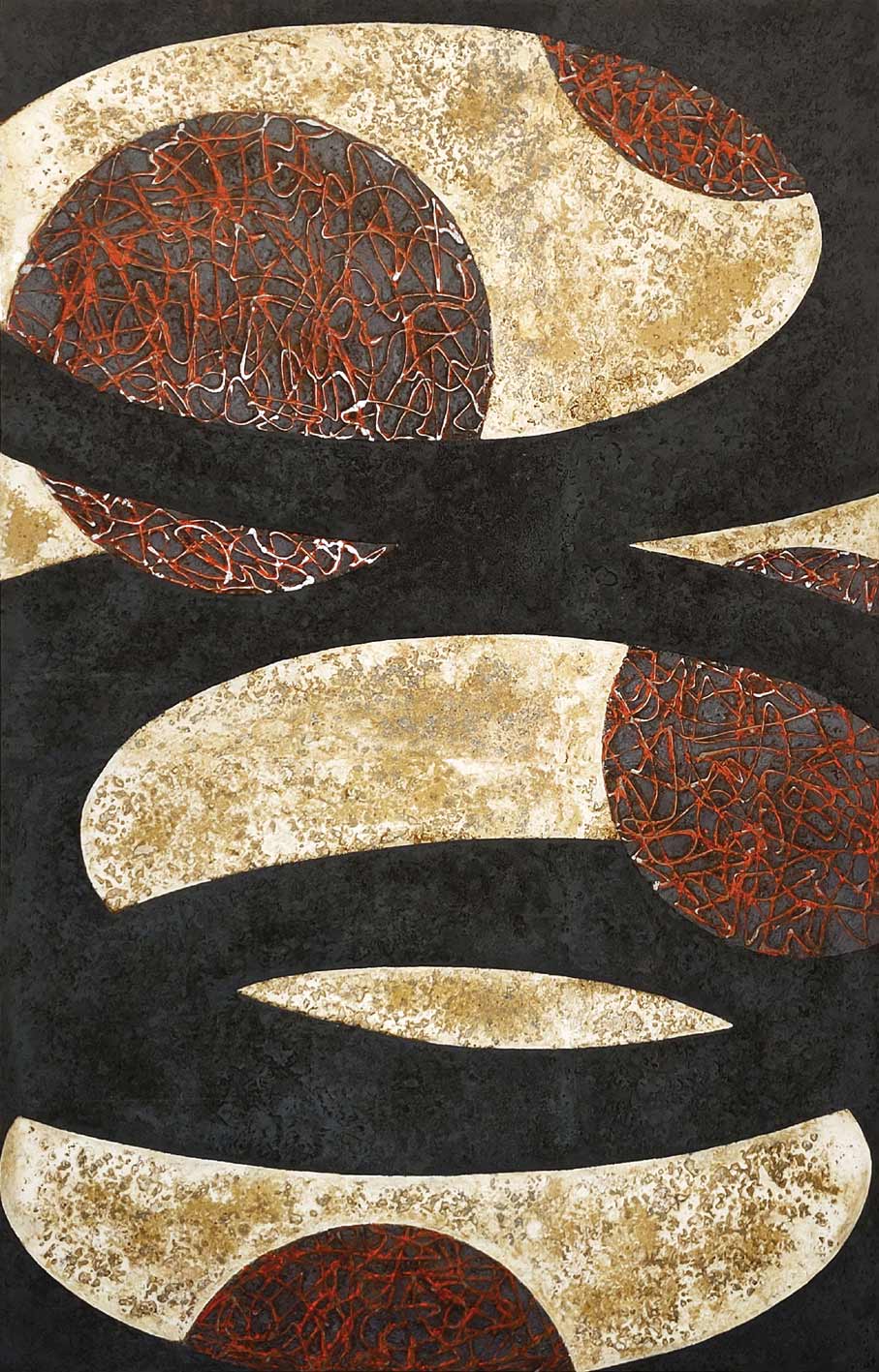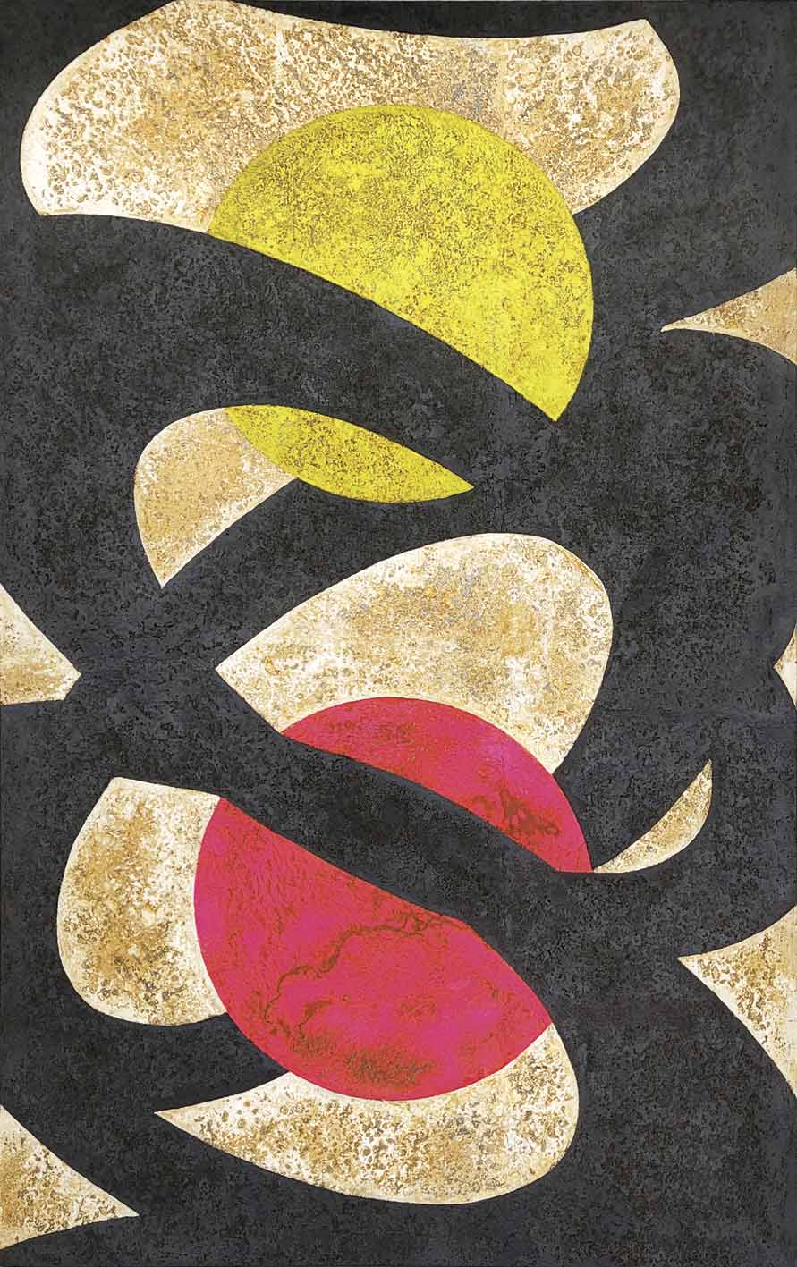 “Demokratie der Farbe” ist der Titel einer Arbeit, die 2009 entstand. Sie wurde zum Vorreiter einer umfangreichen Werkgruppe, bei der das Zusammenspiel einer Vielzahl von Farben die Dynamik der Bildkompositionen bestimmt. Die “Herrschaft” der Farben wird dominant. Formal organisiert sind diese Farbspiele in Gestalt von Kreisen, die jedoch oftmals auch räumlich als Kugeln oder Sphären erscheinen. In anderen Fällen werden die Farbkreise mit zufällig anmutenden und doch genau gesetzten Linien kombiniert. Daneben gehören Kreis- und Kugelformen in Verbindung mit einer kleineren Farbpalette schon lange zu den zentralen Motiven, die immer wieder vielfach eingesetzt und abgewandelt wurden, wie etwa im mehrfach variierten “Lichtblubbern”.