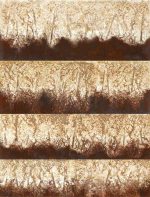 Ockertöne mit ihrem erdigen Charakter gehören genauso wie alle Abstufungen von Schwarz zu den Urtönen unseres Planeten. Ocker in Verbindung mit Rosttönen gehören auch zu den Grundelementen im Werk von Beatriz von Eidlitz. Allein die Präsenz dieser Farbwerte ruft gemeinsam mit dem Schwarz elementare Assoziationen auf. Sei es von Landschaften wie in den “Seestücken” von 2009 mit ihrer aleatorischen Formentfaltung, bei der die Bewegung des Wassers während des Papierschöpfens ihre Spuren hinterlassen hat. Sei es in phantastischen, formal fest umrissenen Bilderfindungen wie “Into the Space”. Oder in den “Mondbildern”, die manches von der Faszination des vertrautesten Erdsatelliten im Bildraum widerspiegeln, mitunter sogar seriell. Einen Gegenpol dazu bilden die urbanen Muster der “Stadtlandschaften”.